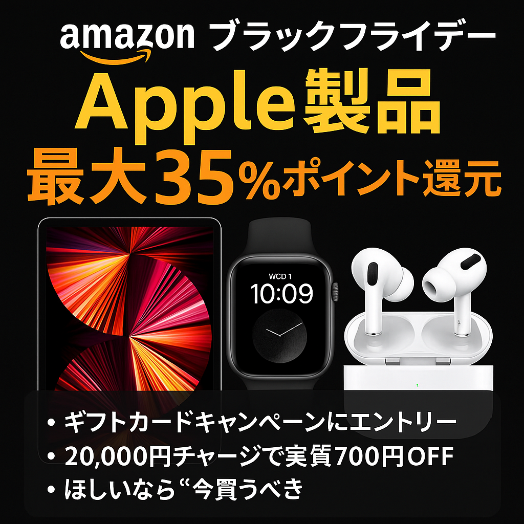 🔰 はじめに 2025年のAmazonブラックフライデーは例年以上にApple製品の割引とポイント還元が大きい“本当の買い時” になっています。 ※画像はAmazonサイトより引用 ✔ iP...