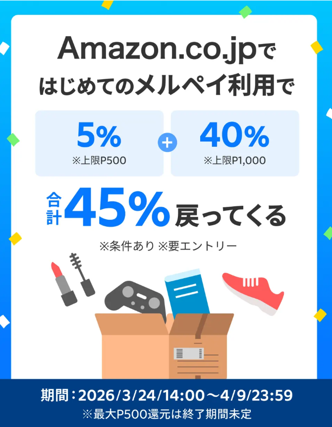 今回いちばん優先したいのは、Amazonのセールそのものではなく、メルペイの40%還元を先に取りにいくことです。